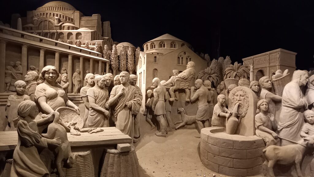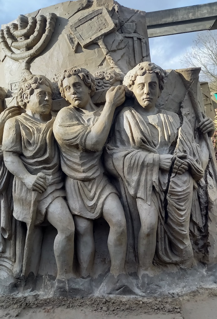 Sinds 5 jaar staat de zogeheten Neder-Germaanse Limes genoteerd op de Werelderfgoedlijst van Unesco. De samenstellers van de expositie grepen deze mijlpaal aan als thema voor het jaarlijkse ‘festival’ met zandsculpturen. Deze grens werd in de eerste eeuwen van onze jaartelling gemarkeerd door een keten van zo’n 20 grensforten en wachttorens langs de Rijn. In Archeologie Museum Hoge Woerd, ondergebracht in een replica van het daar gelokaliseerde Romeinse Castellum, kom je alles te weten over de daar gelegerde soldaten. Zij mochten tijdens hun 25-jarig contract niet trouwen, maar de natuur moest zijn loop hebben. Met lokale vrouwen stichtten zij gezinnen die in het aangrenzende kampdorp woonden. Onder de handen van zo’n 25 internationale kunstenaars komt het Romeinse Rijk in Garderen tot leven. De soms metershoge creaties verbeelden de opkomst, bloei en val van het Romeinse Rijk. De aandacht is niet alleen gericht op de (wan)daden van veroveringsgezinde keizers en soldaten. Je ziet ook minutieus vormgegeven stadsgezichten en straatscènes, waarin het alledaagse tot leven komt. Kleurrijke op religie en mythologie geïnspireerde scènes verlenen de expositie extra glans. Elke sculptuur vertelt een eigen verhaal. Zoals de scène waarin de Hongaarse kunstenaar Zsolt Thoth een vroeg voorbeeld van roofkunst in beeld brengt. In de episode waarin Romeinse soldaten de Menora uit de door hen in het jaar 70 verwoeste tempel van Jeruzalem meedragen, herken ik de voorstelling van de Triomfboog van Titus op het Forum Romanum. Mijn vermoeden dat de barst in de voorstelling geen toeval is wordt door de kunstenaar bevestigd. Met deze scheur brengt hij de toorn van Jaweh in beeld.