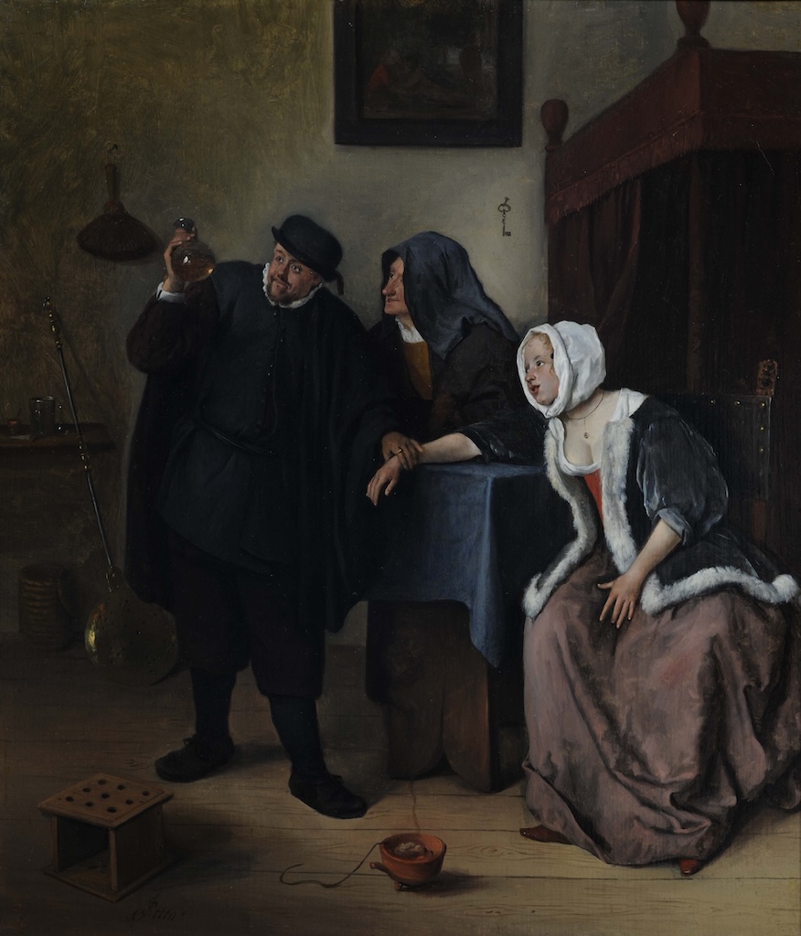 De tentoonstelling is thematisch ingericht. Je ziet Steen onder meer in relatie tot de Leidse fijnschilders. Andere onderwerpen zijn satire en spel en verhalende werken van velerlei soort zoals het geestige Doktersbezoek, waarin een chirurgijn onder het toeziend oog van de patiënt en haar moeder, de inhoud van een urinaal bestudeert. Waar gaat dit over? De sleutel aan de wand naast het hemelbed geeft, samen met het schilderij in het schilderij, het antwoord. Tijdgenoten zagen het meteen. Het meisje lijdt aan minnepijn of erger: ze is zwanger! Met het bovenstaande licht ik slechts een tipje op van de sluier. Let bij je bezoek aan de Lakenhal ook op de parallelle bijschriften. Verschillende werken inspireerden basisschoolleerlingen tot frisse observaties. Lees binnenkort meer op deze website.