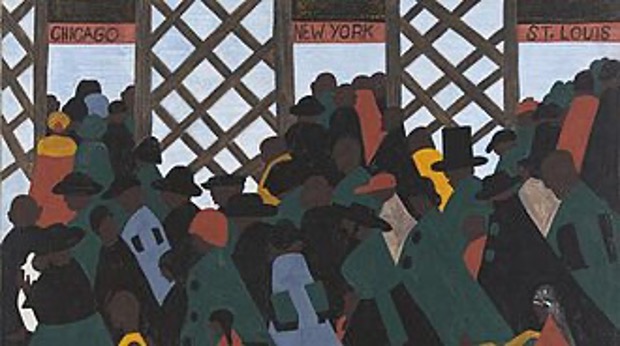 Als 24-jarige brak Lawrence in 1941 door met zijn iconische schilderijenserie ‘The Great Migration’. In 60 panelen bracht hij de massale volksverhuizing in beeld. Zijn kleurrijke in figuratief-kubistische stijl geschilderde werken laten zich lezen als een visuele [zwarte] geschiedenisles. Je komt abolitionisten tegen, momenten uit de strijd voor Civil Rights van de jaren ’50 en ’60 en scènes uit het dagelijks leven.