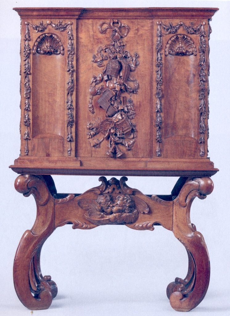 Luiermandkast met houtsnijwerk afbeeldingen van o.a een wieg en een kakstoel