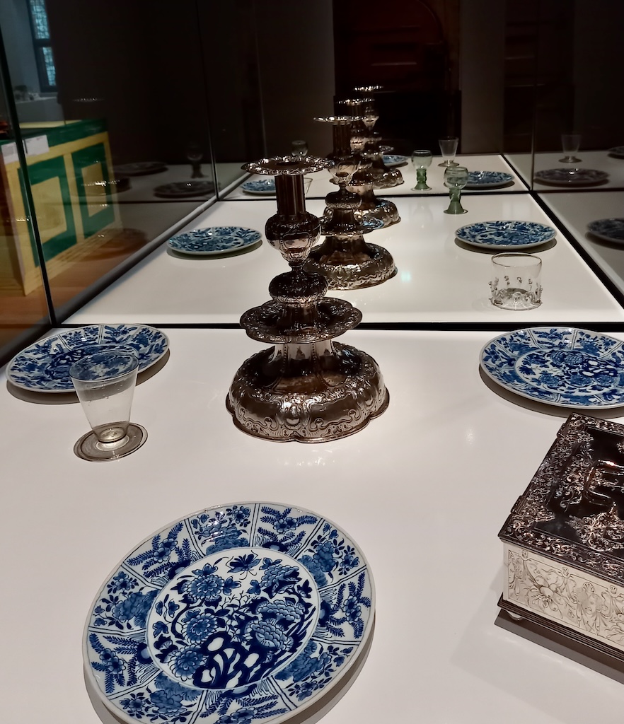 Tafel met Delftsblauw servies en zilveren kandelaars in kwabstijl