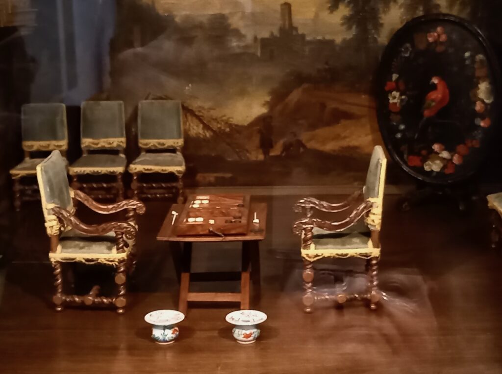 Bij het maken van de tentoonstelling waren de Poppenhuizen van Petronella Oortman (1686-1710) en Petronella Dunois van onschatbare waarde, aldus medesamensteller van de tentoonstelling Alexander Dencher. Met voorwerpen die niet meer bewaard zijn geven ze als tijdcapsules een (ideaal)beeld van de woonstede van een welgestelde koopmansfamilie. De huizen informeren ons niet alleen over de wand- en vloerbedekking, maar ook over de inrichting van de verschillende vertrekken en voorwerpen waarvan wij het gebruik tegenwoordig -gelukkig- niet meer kennen. In de zogeheten ‘Sael’ staan twee kwispedoors, porseleinen kommen, waarin de heren na gebruik hun pruimtabak konden uitspugen.