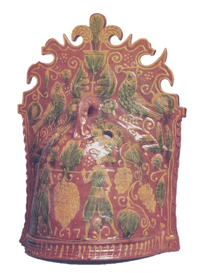 Onder een monumentale uit karton opgebouwde schouw staat een tegenwoordig onbekend voorwerp: een vuurstolp. Op het in okertinten en olijfgroene aardewerk herken ik een Bijbelse kleurplaat van de lagere school. Twee mannen met 17e -eeuwse hoofddeksels torsen een enorme tros druiven aan een stok. Zou ik de enige zijn die hierin het oerbeeld van agent 007 herken? Terwijl de 17e eeuwers genoeglijk bijeenzaten bij de haard konden ze hun Bijbelkennis testen. Op de vraag wat zien we hier? Zou een van de ouderen antwoorden: de verspieders die na hun geheime missie rijkelijk beladen terugkeren uit het Beloofde land. Sla er Numeri 13 maar op na.