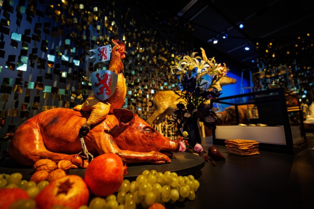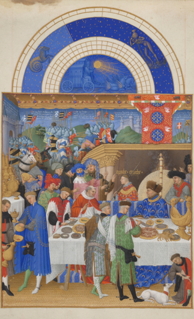 De regeringsperiode van Filips de Goede (reg. 1419-1467) wordt geïllustreerd met wandkleden, schilderijen en objecten, die een indruk geven van zijn vrijetijdsbesteding: de valkenjacht en toernooien. Impressies van feestelijke maaltijden weerspiegelen letterlijk en figuurlijk het goede leven tijdens het zijn bewind. Om de Bourgondische sfeer ten volle te proeven zijn op de wanden uitvergrote miniaturen uit de Très Riches Heures du Duc de Berry aangebracht. Ze werden tussen 1411-1415 geschilderd door de gebroeders Limbourg. Het originele manuscript uit de Bibliothèque National de Paris ontbreekt, maar je ziet wel een facsimile. De bezoeker kan zelfs aanschuiven bij het extravagante Banket van de Fazant. Wanneer de Turken in 1453 Constantinopel veroveren vat Filips de Goede als beschermer van het ware geloof, het plan op voor een kruistocht. Tegenwoordig maak je grote plannen wereldkundig via social-media en je zet een crowd-funding op. Om medestanders voor zijn onderneming te enthousiasmeren organiseerde Filips in 1454 een gigantisch banket. De aanwezigen kregen niet alleen een menu van tien gangen voorgeschoteld, maar zij werden ook op allerlei spectaculaire feestelijke ‘tussengerechten’, intermezzi, vergast. Het ene hoogtepunt volgde op het andere. Een kleurrijk ooggetuigenverslag maakt melding van een groep muzikanten die tijdens het diner tevoorschijn kwam uit een reuzenpastei en er werd zelfs een leeuw ten tonele gevoerd. De absolute climax vormde de personificatie van de bedreigde stad: zittend op een olifant betrad Vrouwe Constantinopel de feestzaal.