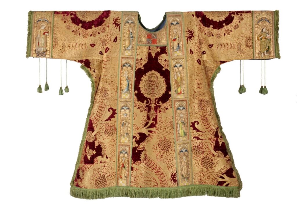 Over al deze aardse bezigheden was de zegen van de Almachtige wenselijk. Om zich van een plek in de hemel te verzekeren waren schenkingen aan de kerk dan ook bon usance. Niet alleen van geld, goederen en kunstwerken, maar ook kinderen werden aan de kerk gewijd. Zo belandde David van Bourgondië, een van de vele bastaardzonen van Filips de Goede, van 1456-1496 op de bisschopszetel van Utrecht. Van zijn tijd als geestelijk leider van dit bisdom dateert een goudbrokaten dalmatiek met granaatappel- en distelpatroon. De voor- en achterzijde van dit kostbare liturgische gewaad zijn versierd met zogeheten aurifriezen, stroken met in gouddraad en zijde geborduurde heiligen. De dalmatiek is onderdeel van een zogeheten vierstel bestaande uit een koorkap voor de bisschop, een kazuifel voor de voorganger en twee dalmatieken. Deze werden gedragen door de diakenen, de assistenten van de celebrant. Naast de dalmatiek zie je een drieluik waarop de Meester Van Delft het portret van bisschop David van Bourgondië naast een biddende stichter aanbracht. Vanaf het zijpaneel aanschouwen zij de Maagd Maria en het Christuskind. Uit mijn tijd als rondleider in Museum Catharijneconvent herken ik beide werken. Het was even zoeken naar het embleem van de ‘vredelievende’ tak van de Bourgondiërs; de tondeldoos met vuurslag. De laatmiddeleeuwse ‘aansteker’ die staat voor het belang van of liever: de wens naar stabiliteit en vrede in het hertogdom, want de ambtstermijn van David wordt gekenmerkt door de ene (burger)oorlog na de andere. De tegenwerking van de burgers van Utrecht leidde in 1483 zelfs tot het beleg van zijn eigen stad, waarover je in de canon van Nederland meer leest. Het vuur verwijst symbolisch naar beschaving en welvaart. De tondeldoos die prominent te zien is op de (in Venlo niet getoonde) koorkap ontbreekt op de dalmatiek, maar als je goed kijkt ontdek je wel de vlammen.
