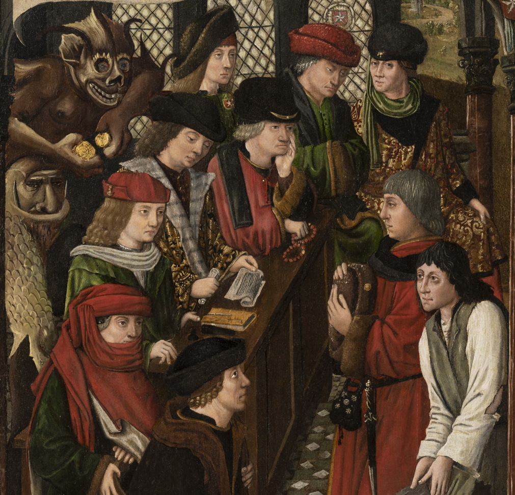 Toch hadden ze het kunnen weten. Miniaturen in middeleeuwse gebedenboeken zijn er duidelijk over. In illustraties bij de bidstonden voor de dodenwake, de dodenvigilie, zie je meer dan eens hoe engelen met vervaarlijke duivels strijden om de ziel van de overledene. Op een impressie van een rechtszitting uit het Bonnefanten Museum bracht de anonieme schilder met grijpgrage Boschiaanse duivels een soortgelijke dubbele boodschap aan. Staand achter het panel met raadslieden moeten zij potentiële boosdoeners afschrikken en magistraten aansporen om rechtvaardig en onafhankelijk te oordelen. Het paneel bevond zich rond 1477 in het Maastrichtse Dinghuis, waar destijds recht werd gesproken.